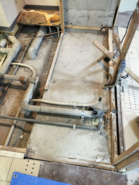 洗面台とトイレの床下ーBefore。写真上部の傷んだコンパネ部分が旧便器設置位置。汚水管は何故か共用排水管に直結されずにスラブに埋まっている。右下が旧洗面台、上部左へのエルボがUBへの配管。同斜め左上への配管が共用排水管への接続。汚水管と雑排水管は交差することが無い配置だった